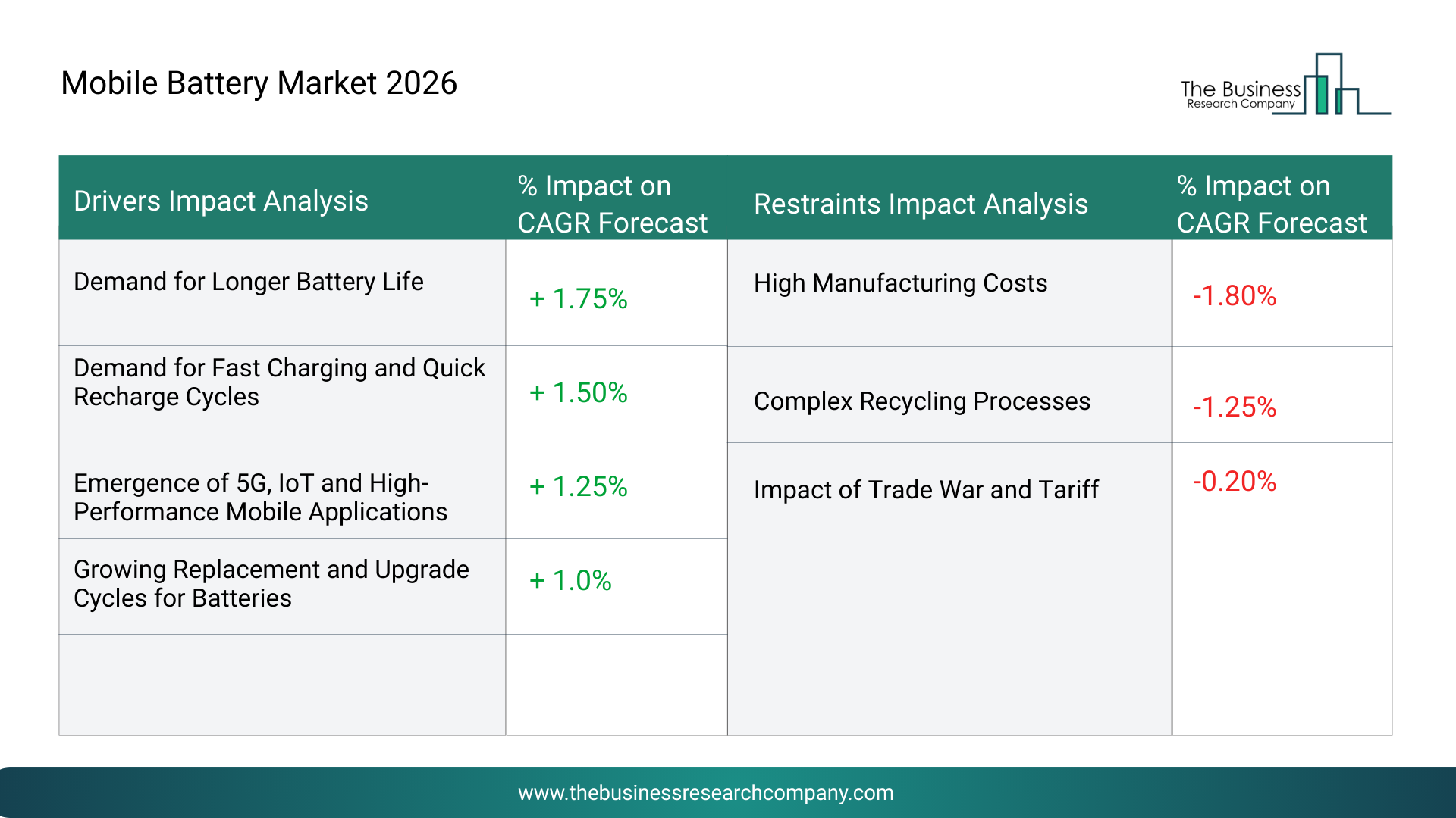 Demand For Fast Charging And Quick Recharge Cycles - The demand for fast charging and quick recharge cycles will emerge as a major factor driving the expansion of the mobile battery market by 2030. The modern digital lifestyle involves frequent app switching, high-speed browsing, continuous streaming, video calls and gaming, all of which intensify battery drain. This creates strong consumer preference for devices that can recharge in minutes instead of hours. In response, manufacturers are adopting advanced charging protocols, higher-power charging standards and more efficient thermal management systems, all of which stimulate growth in specialized battery components and optimized cell chemistries designed to withstand faster charge acceptance. Battery makers are also enhancing durability to ensure that rapid charging does not cause accelerated degradation, thereby expanding opportunities for improved materials and protective technologies. Consequently, demand for fast charging and quick recharge cycles is projected to contributing to a 1.3% annual growth in the market.
