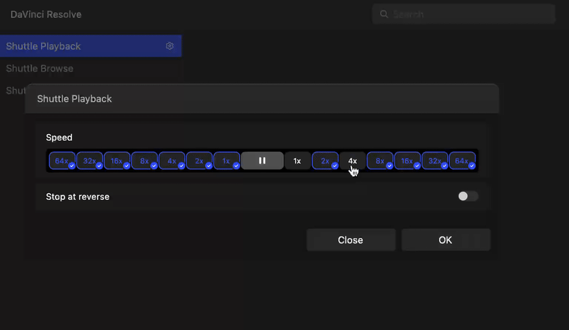Transitioning between speeds is seamless: turning the dial from 64× down to 32× happens in one motion, unlike JKL key commands that require a full stop before changing direction. For long-form review or rough cut verification, the “driving-like” tactile control of Shuttle Playback introduces a sense of continuous speed modulation — smooth, intuitive, and rhythmically natural.