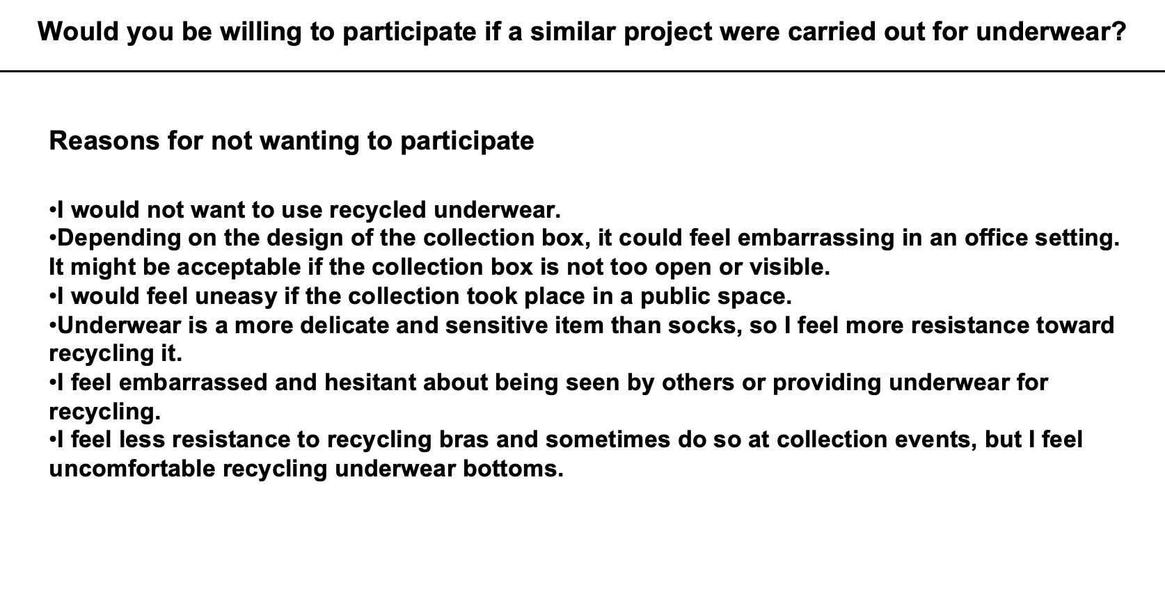 By contrast, willingness to participate declined when the scope of collection was expanded to include innerwear or underwear. 29.2% of respondents reported reluctance to participate in underwear collection, revealing a substantially higher psychological barrier compared with socks.
