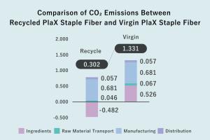 2) During yarn production, recycled PlaX staple fibers showed approximately 80% lower CO₂ emissions compared to conventional PlaX fibers
