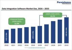 The global data integration software market is projected to grow from US$ 6.8 Bn in 2026 to US$ 16.1 Bn by 2033, at a CAGR of 13.1%, forecast 2033