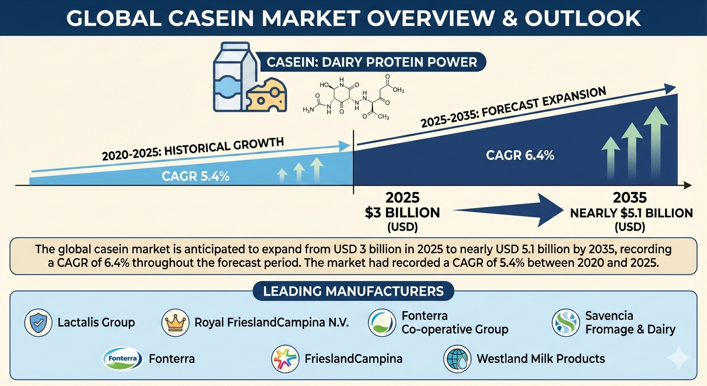 NEWARK, DE, UNITED STATES, January 29, 2026 /EINPresswire.com/ -- The global casein market is entering a high-growth phase, projected to rise from USD 3.0 billion in 2025 to nearly USD 5.1 billion by 2035, expanding at a 6.4% CAGR. This marks a clear acceleration from the 5.4% CAGR recorded between 2020 and 2025, reflecting stronger integration of functional proteins across food, sports, and clinical nutrition.