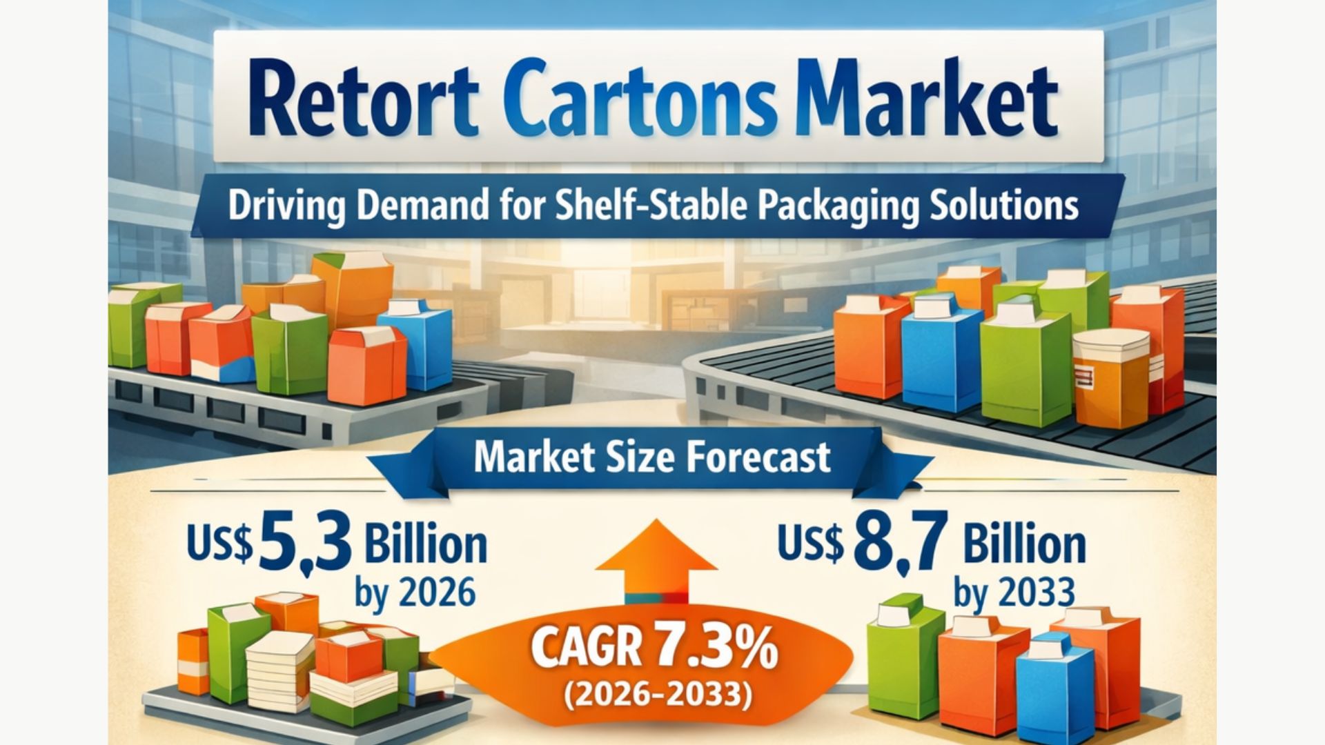 LONDON, LONDON, UNITED KINGDOM, February 17, 2026 /EINPresswire.com/ -- The global retort cartons market is poised for steady expansion as food and beverage manufacturers increasingly prioritize packaging formats that deliver extended shelf life, operational efficiency, and consumer convenience. According to the latest study by Persistence Market Research, the global retort cartons market size is likely to be valued at US$5.3 billion in 2026 and is expected to reach US$8.7 billion by 2033, growing at a CAGR of 7.3% between 2026 and 2033. The market’s growth is primarily driven by the increasing adoption of shelf-stable packaging solutions by manufacturers seeking to balance convenience, product safety, and cost-effectiveness. Retort cartons are rapidly replacing traditional metal cans and glass containers due to their lightweight design, improved shelf appeal, and compatibility with high-temperature sterilization processes.